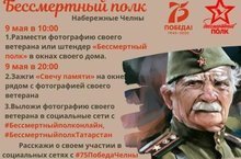 В Татарстане стартует Всероссийская акция «Бессмертный полк». Из-за эпидемии коронавируса мероприятие пройдет в онлайн-формате. Стать участником «Бессмертного полка» может каждый. Для этого необходимо собрать информацию о своем родственнике, принимавшем участие в Великой Отечественной войне. Сделать фотографию или снять видео с его изображением, подготовить текст о своем герое, указав его фамилию, имя и отчество, род войск или его деятельность, годы участия в войне и любую информацию, которая кажется важной. Текст и фото нужно опубликовать до 5 мая на персональной страничке в социальных сетях: Вконтакте, Инстаграм или Одноклассники. Также необходимо добавить хэштеги: #бессмертныйполкРоссии, #бессмертныйполкТатарстана, #бессмертныйполконлайн. Все опубликованные истории будут отображены в официальном сообществе регионального отделения Бессмертного полка России в республике и на общероссийском онлайн-ресурсе.