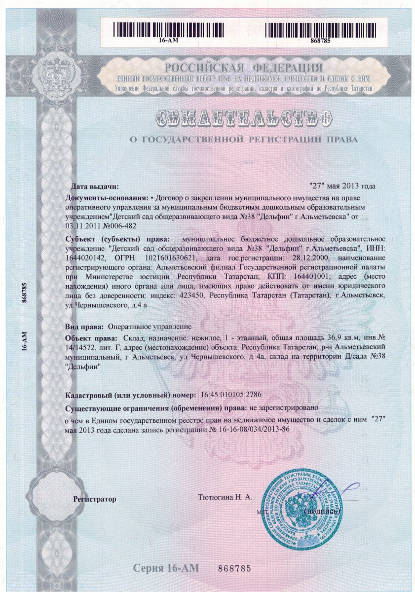 Свидетельство о государственной регистрации права на недвижимое имущество -склад