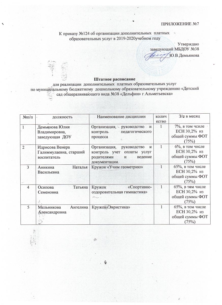 Штатное расписание для реализации дополнительных платных образовательных услуг на 2019-2020 учебный год