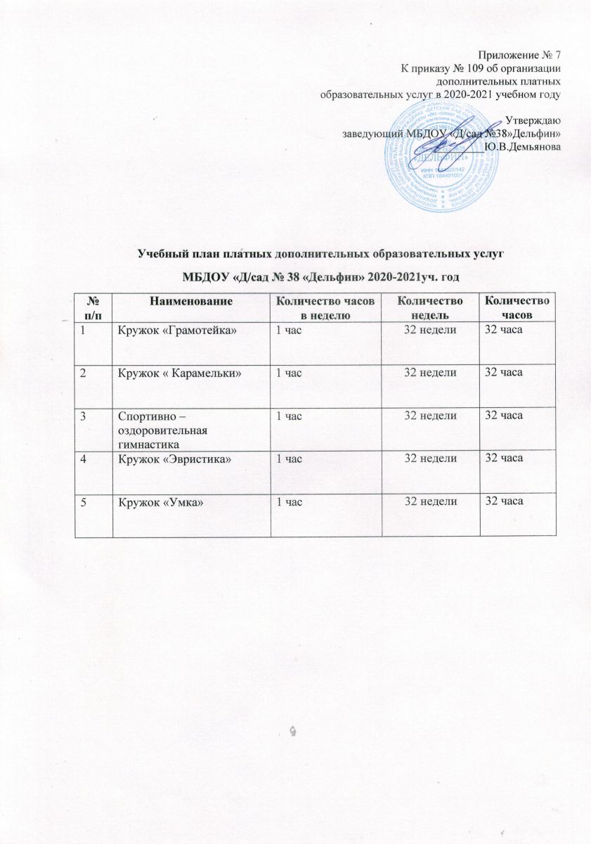 Учебный план для реализации дополнительных платных образовательных услуг на 2020 -2021 учебный год