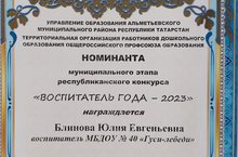 Ежегодно в нашем городе проводится профессиональный конкурс «Воспитатель года». Для педагога участие в данном конкурсе требует определённой смелости, дает возможность продемонстрировать свои достижения в профессиональной деятельности, предъявить результаты своей работы, обмена опытом с коллегами. Среди участников конкурса была наш воспитатель Блинова Юлия Евгеньевна. По результатам муниципального этапа – Юлия Евгеньевна награждена дипломом номинанта. Поздравляем!!!