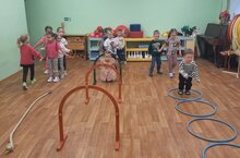 На занятии по физической культуре в средней группе воспитанники обучались ходить по гимнастической скамейке, прыгать через обручи в парах.