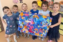 Сегодня ребята группы "Теремок" создали коллективную картину "Океанариум", в котором поселились разнообразные рыбы