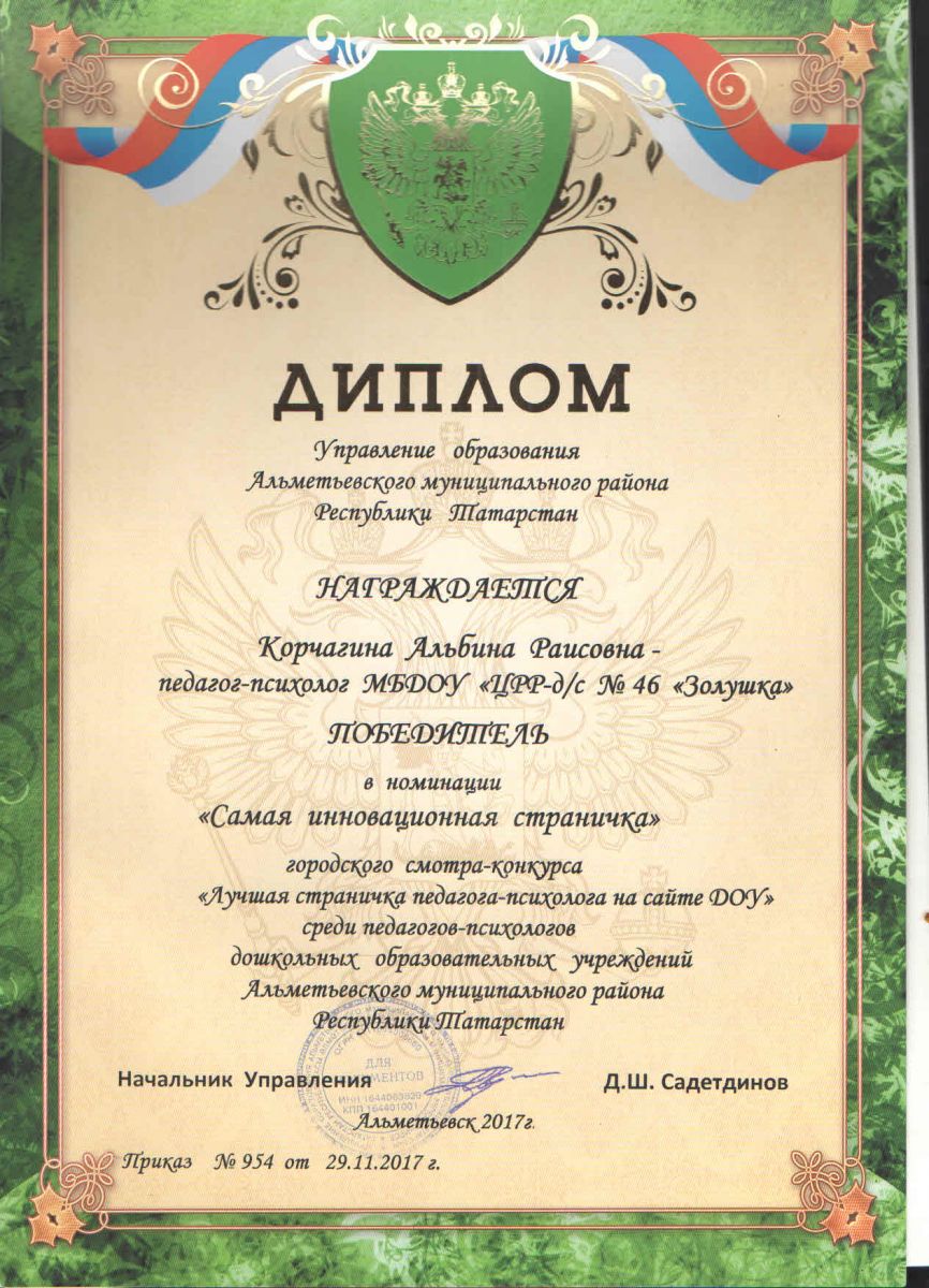 Приглашаем всех желающих на страничку педагога-психолога на официальном сайте МБДОУ "ЦРР-д/с №46 "Золушка", ставшую победителем в муниципальном конкурсе "Лучшая страничка педагога-психолога на сайте ДОУ" среди педагогов-психологов ДОУ АМР РТ в номинации "Самая инновационная страничка".
