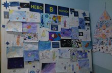 В фойе детского сада воспитателем О.Г,Ленц организована выставка детских рисунков групп 5,6,7,8,9,11,12. на тему "Небо в космос". Дети приняли активное участие.