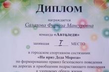 Воспитателя подготовительной к школе группы №8 Салахову Фирузю Мансуровну с победой в городских спортивных состязаниях "На приз Деда Мороза" по формированию правил безопасного поведения на дорогах и приобщения подрастающего поколения к здоровому образу жизни.