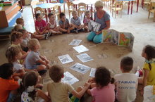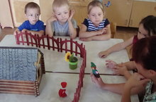 28.07.16 воспитатель первой категории Сопина Анна Сергеевна в целях реализации задачи по формированию безопасного поведения на улице разыграла перед детьми ситуацию, отражающую правильную( неправильную) тактику поведения( безопасность на улице), используя образные игрушки, отражающие возрастные характеристики людей( ребенок, мужчина), мужчина приглашает ребенка выйти со двора дома.