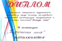 Дипломом зонального открытого туристского фестиваля среди команд молодежных комитетов организаций, предприятий и сельских поселений "Легенды лета" награждается воспитатель МБДОУ Гайипова А.С. в номинации "Туристская песня".