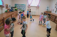 Ребятам средней группы №3 нравится играть в подвижную игру «Найди свой гараж». Дети представляют себя маленькими машинками, и под веселую музыку каждый едет к "гаражу" - геометрической фигуре, найти который помогает фигура, изображенная на руле, игра повторяется 2-3 раза. Во время игры дети упражняются в умении различать и называть геометрические фигуры.