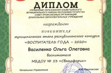 Завершился муниципальный этап Республиканского конкурса "Воспитатель года - 2020" среди педагогов дошкольных образовательных учреждений Альметьевского муниципального района. Конкурс проводится ежегодно Управлением образования АМР совместно с Советом профсоюзных организаций дошкольных образовательных учреждений в целях выявления и поддержки инновационных методов, развития творческой инициативы педагогических работников, повышения их профессионального мастерства. В этом году на звание лучшего воспитателя г. Альметьевск претендовали 12 педагогов ДОУ, среди которых приняла участие воспитатель нашего детского сада группы № 7 "Сказка" - Василенко Ольга Олеговна. По итогам трех этапов конкурса: творческая презентация, педагогическое мероприятие с детьми и мастер-класс определились 3 педагога, набравших наибольшее количество баллов, среди которых победителем стала Василенко Ольга Олеговна. Ольге Олеговне предстоит защищать наш муниципальный район в зональном этапе Республиканского конкурса «Воспитатель года – 2020». Желаем удачи!
