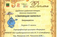 1 и 2 февраля в г.Альметьевске проходил городской и районный конкурс детского творчества "Звенящая капель". Воспитанники нашего детского сада приняли участие в конкурсе в номинации "Хореография". По итогам конкурса детский хореографический коллектив "Виктория" получил Диплом лауреата 2 степени.
