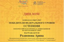 Воспитанники нашего детского сада: Галимов Ризван, Родионова Арина, Муллаянова Амила приняли участие в 3 Всероссийской олимпиаде для дошкольников по окружающему миру. По результатам Олимпиады - Родионова Арина стала победителем 1 Степени.