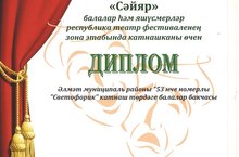 В октябре 2018 г. МБДОУ «Д/с № 53 «Светофорик» г. Альметьевска» принял участие в Республиканском фестивале детских и юношеских театров «Сайяр», организованное Министерством образования и науки РТ совместно с журналом «Сәхнә» и детским журналом «Салават күпере». На фестиваль было представлено видео театрального представления воспитанников нашего детского сада, по произведениям татарский народной сказке «Өч кыз» (“Три дочери”). 16 ноября в г. Казани, в драмтеатре им. К.Тинчурина прошло награждение участников Республиканского фестиваля, на котором наш детский сад был награжден Диплом победителя зонального тура, а так же Дипломом лауреата АО «Татмедиа». Поздравляем с заслуженной наградой!