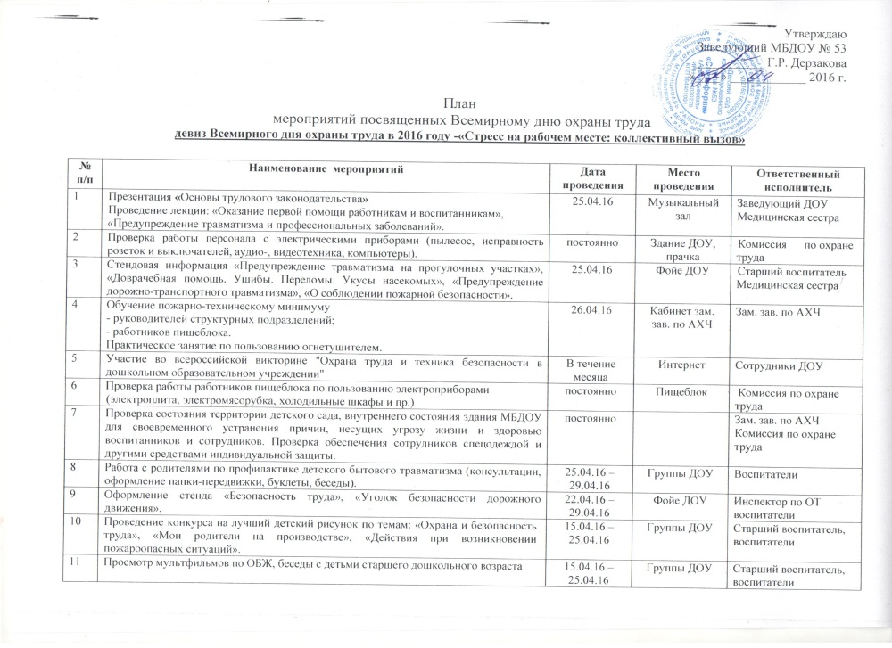План проведения мероприятий посвященный Всемирному дню охраны труда - 2016 год.