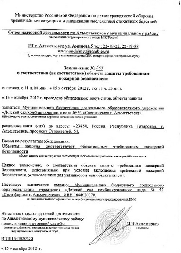 Заключение о соответствии объекта защиты требованиям пожарной безопасности