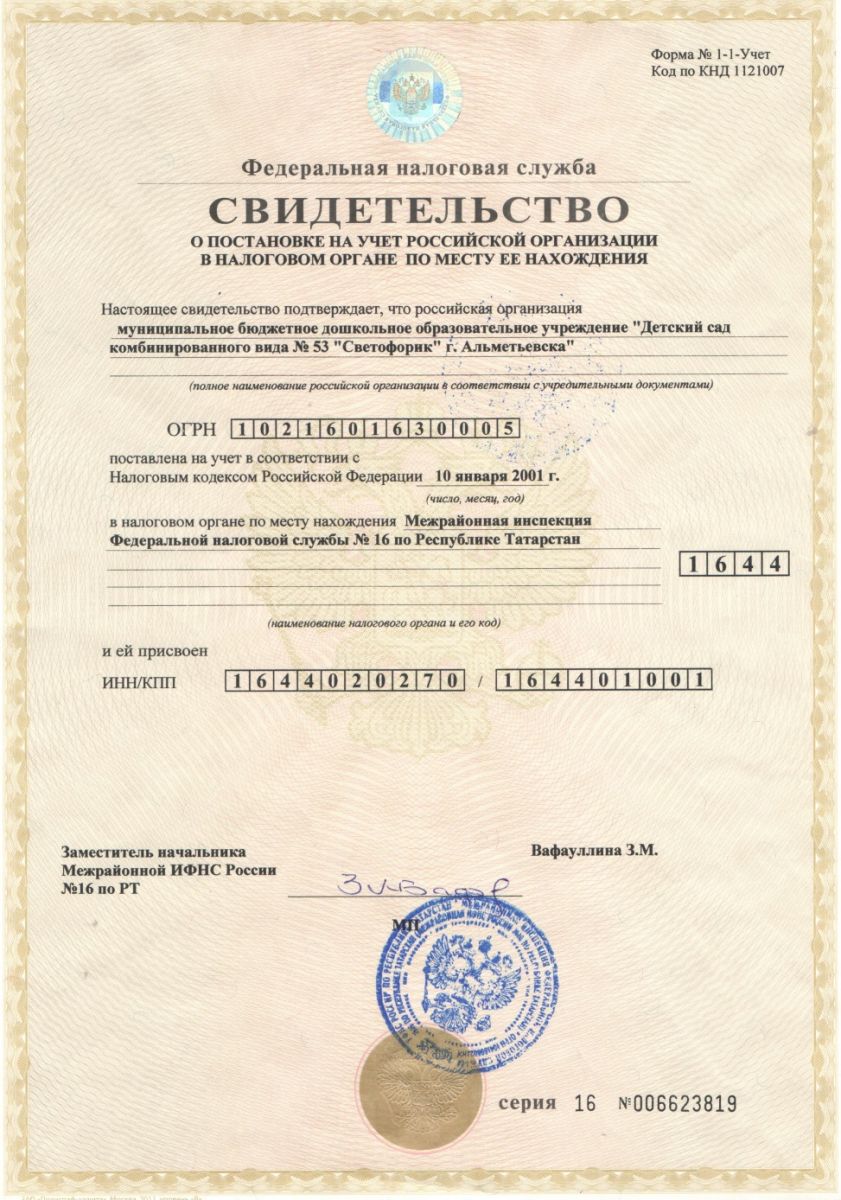 Свидетельство о постанвке на учет Российской организации в налоговом органе по месту ее нахождения