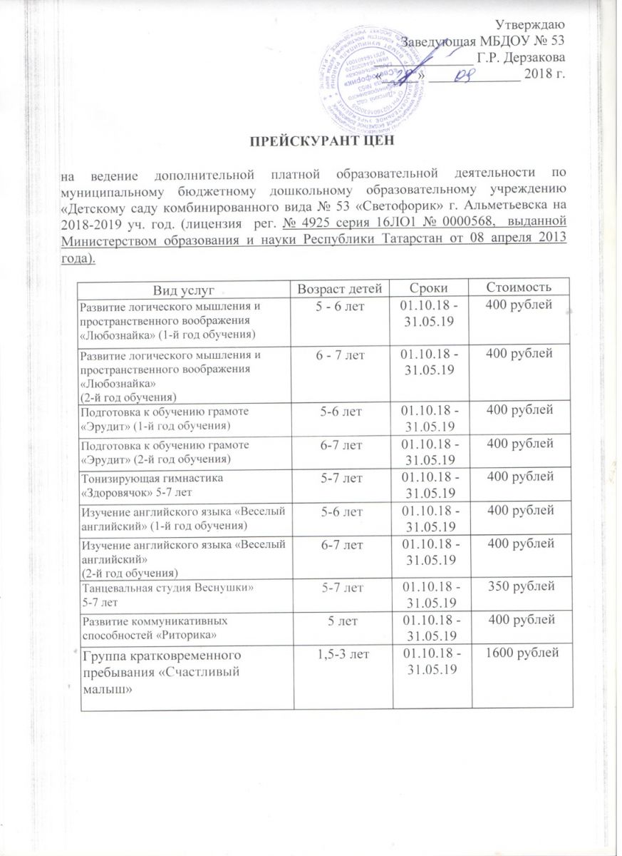 Расписание на оказание допуслуг на 2018-2019 учебный год