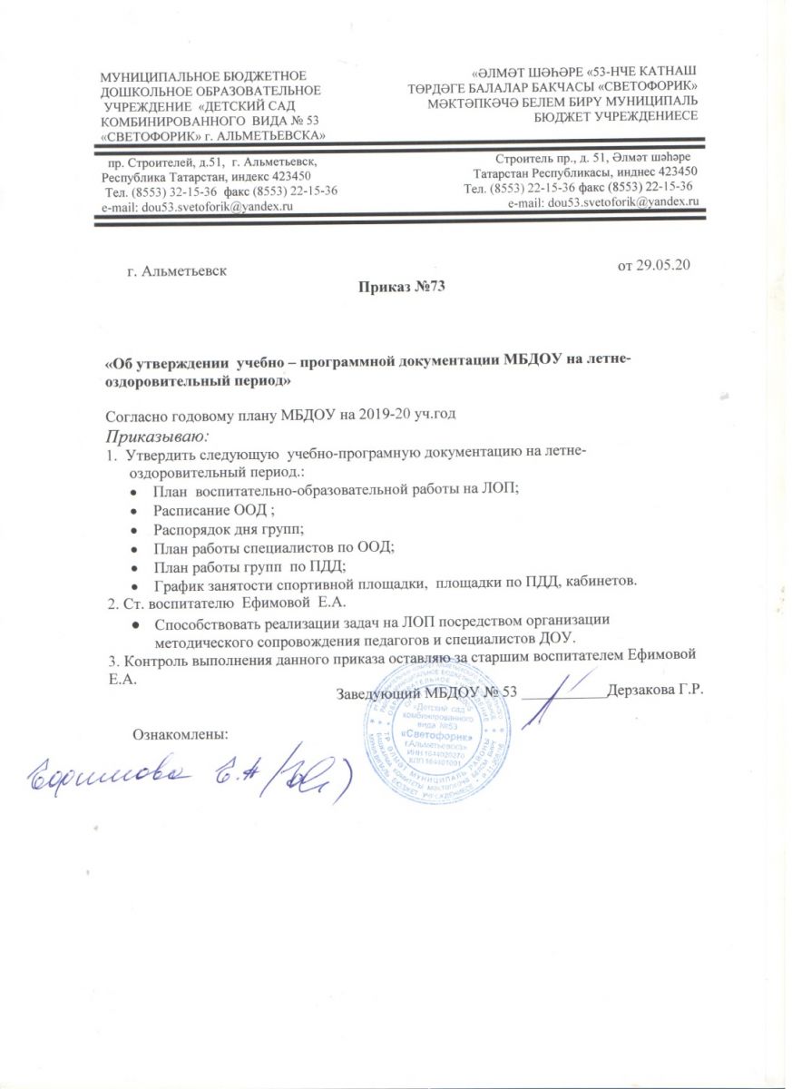 Приказ об утверждении учебно-программной документации ДОУ на ЛОП