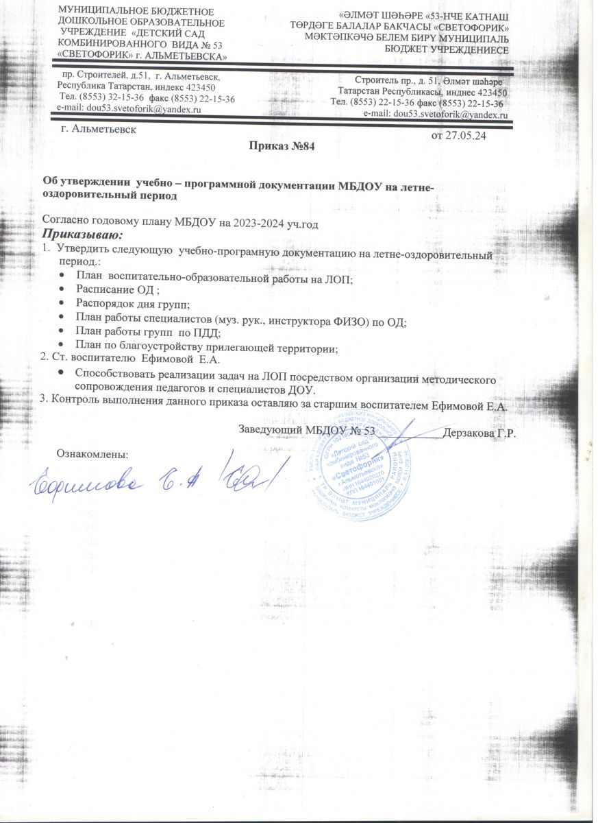 Приказ № 84 от 27.05.2024 г. "Об утверждении учебно-программной документации ДОУ на ЛОП"