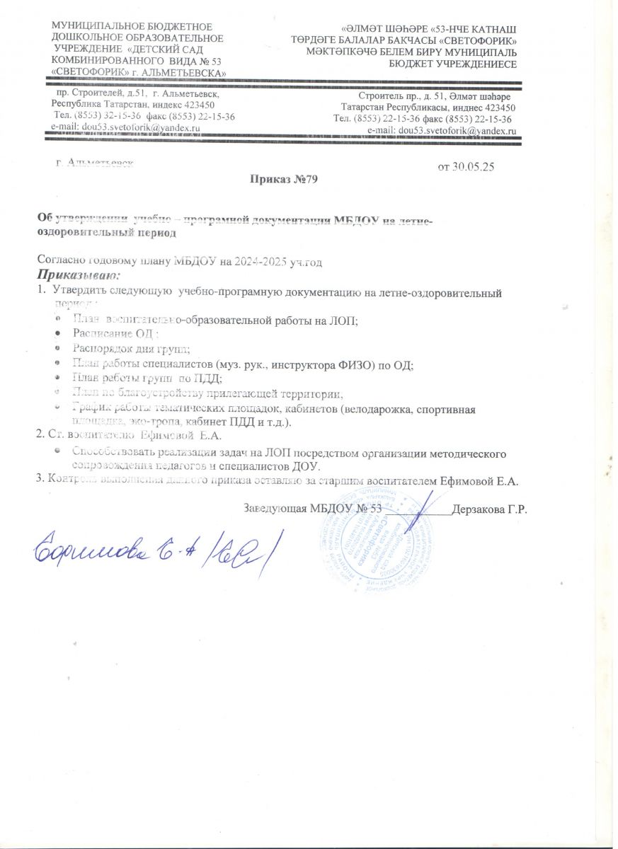 Приказ № 79 от 30.05.2025 г. "Об утверждении учебно-программной документации ДОУ на ЛОП"