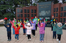Возле памятника провели беседу, прочитали стихотворения, спели песню "Катюша", выполнили упражнения с флажками и возложили цветы. -