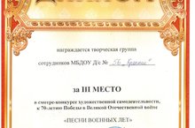 10 апреля 2015 года на сцене Молодежного центра пршел отборочный тур смотра - конкурса художественной самодеятельности, посвящённого 70- летию Победы в Великой Отечественной войне среди сотрудников образовательных учреждений Альметьевского муниципального района, где участвовал танцевальный коллектив "НАДЕЖДА" нашего детского сада -