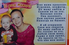 26.11.2015г. Музыкальный руководитель О.Ю. Зиннурова с коллективом педагогов организовала и провела музыкальное различение «Мамочка у меня одна», посвящённое Дню матери. Дети старшего дошкольного возраста и средней группы «Родничок» порадовали родителей праздничным концертом. Мамы были не только слушателями поздравлений, но и активными участниками подвижных игр: пекли блины, заплетали косы для сказочного героя, гостя праздника, Быбы Яги. Шутки, смех и радость поднимали настроение у всех присутствующих на празднике.