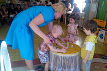 В рамках выполнения годового плана МБДОУ «ЦРР – д/с №57 «Соловушка» на 2014-2015 учебный год воспитатель Надежда Рашидовна Чаповая 05.03.2015 г. показала открытое мероприятие «Организация игровой деятельности «Зайка в гости к нам пришёл» с участием детей группы раннего возраста. Дети в непринуждённой обстановке узнавали много нового и интересного: о посуде, сервировке стола, этикете; в игровой деятельности проявляли свои знания, полученные раннее, о правилах приёма гостей и культурно-гигиенических навыках. Мероприятие получило положительные отзывы от присутствующих коллег.