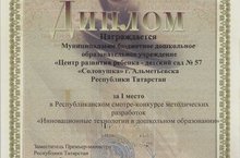 Поздравляем МБДОУ "ЦРР-д/с № 57 "Соловушка", занявший 1 место в Республиканском конкурсе методических разработок "Инновационные технологии в дошкольном образовании" /Киселева Гульнара Рашидовна, Мингазова Райхана Абузаровна/