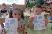 Не смотря, то что ещё летний период, малыши группы Соловушка закрепляют уже с познакомившимися геометрическими фигурами квадрат, круг, треугольник. Были проведены весёлые игровые занятия.