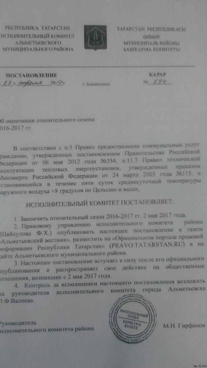 Постановление №694 от 27.04.2017г "Об окончании отопительного сезона 2016 - 2017г"