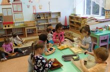 В рамках реализации совместного проекта ПАО Татнефть и Управление образования «Детские сады Альметьевска: открытие каждый день» педагоги нашего детского сада прошли профессиональную переподготовку на воспитателей по системе М. Монтессори. В рамках этого проекта в группе №11 «Звездочки» создали развивающую среду с использованием материалов М. Монтессори. Каждый материал имеется в единственном экземпляре. В группе материалы расставлены по зонам, каждая зона отвечает за развитие определённых способностей. Таким образом, ребёнок может выбрать, каким материалом он хочет работать. Каждая зона интересна сама по себе – зона Подготовительных материалов, зона УПЖ (упражнения практической жизни – все то, что делаем в обычной жизни – протирание, подметание, мытье, стирка, глажка – примечательно что материалы самые настоящие, а не игрушечные), зона Сенсорики, зона Математики, зона Языка, зона Космоса. Работа с каждым материалом несут две цели: прямую и косвенную (например: прямая - растегивание и застегивание пуговиц, косвенная – развитие самостоятельности). Чтобы минимизировать вмешательство взрослых в процесс развития детей, Монтессори-материалы выполнены так, что ребенок может сам увидеть свою ошибку и устранить её. Таким образом ребенок учится не только устранять, но и предупреждать ошибки.