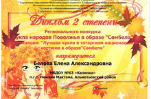Воспитатель средней группы №1 Белова Е.А. приняла участие в региональном конкурсе "Кукла народов Поволжья в образе "Сөмбелә". По итогам конкурса была награждена Дипломом 2 степени в номинации "Лучшая кукла в татарском национальном костюме в образе ""Сөмбелә".