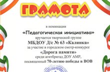 Творческую группу детского сада и агитбригаду детского сада в номинации "Педагогическая инициатива" за участие в городском смотре-конкурсе "Дорога памяти" среди агитбригад ДОУ АМР, посвященный 70-летию Победы в ВОВ.