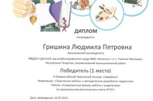 музыкального руководителя Гришину Людмилу Петровну , занявшая 1 место в III Всероссийском творческом конкурсе "Одареша" в номинации "Творческие работы и методические разработки педагогов" .