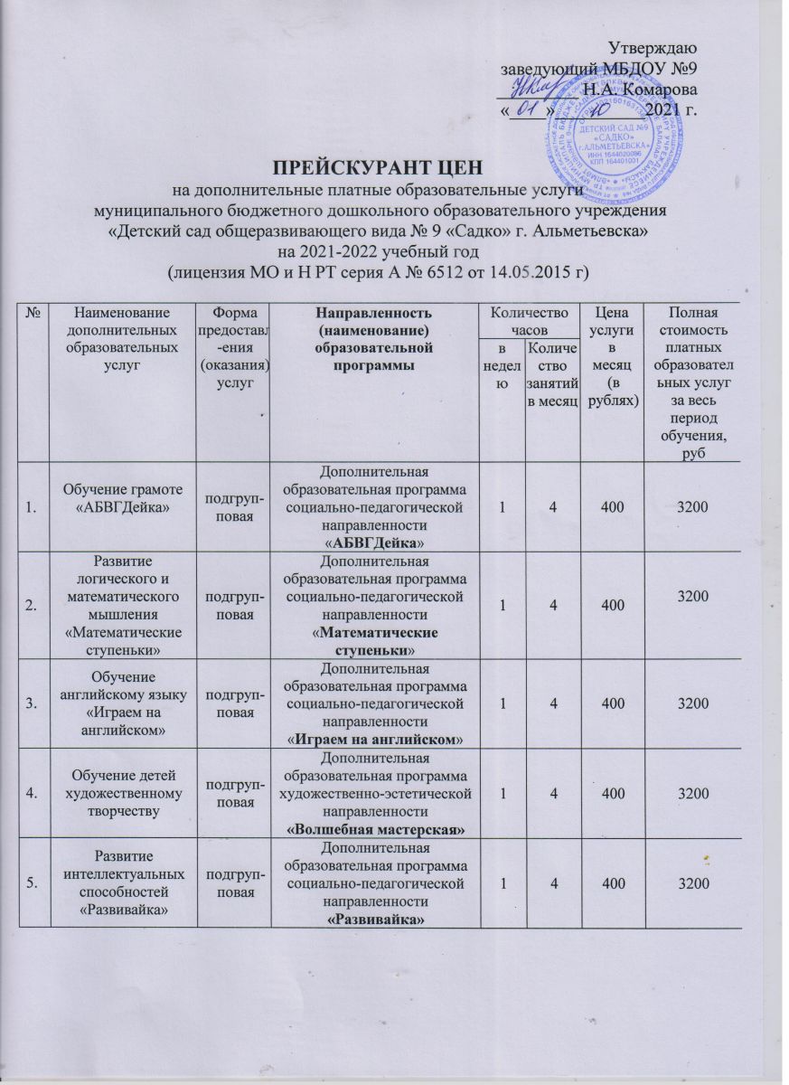 Прейскурант цен на дополнительные платные образовательные услуги 2021-2022