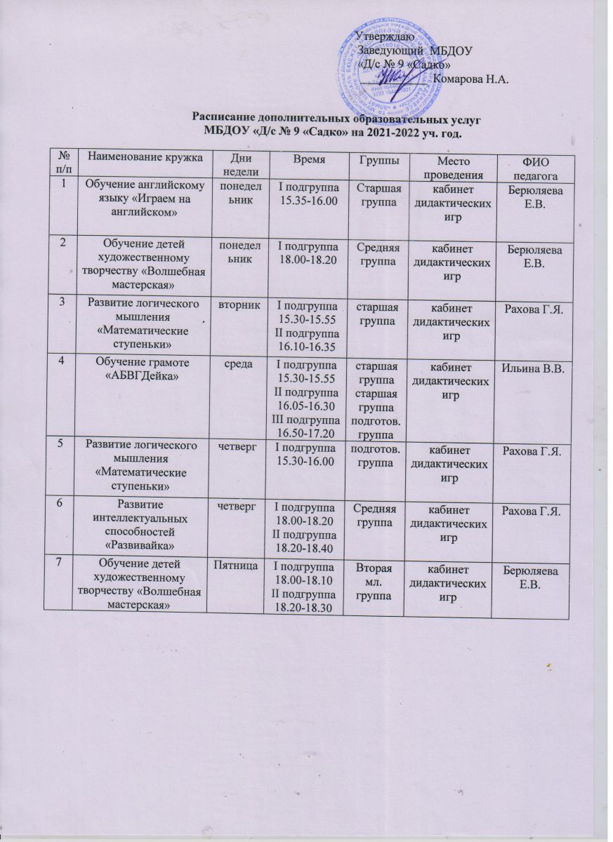 Расписание дополнительных образовательных услуг на 2021-2022 уч. год