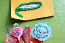 Учили пальчиковую игру "Яшелчәләр", играли в настольный театр "Репка". Сегодня старшие дети были заняты подготовкой материала для игры в лото на тему "Овощи" для малышей. Учились вырезать парные картинки путем складывания цветной бумаги пополам и симметричного вырезания. -