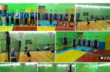 Школьный этап республиканского проекта "Школьная волейбольная лига". Команда юношей 7-8 класс и сборная команда девушек. Счет партии 2 : 1 в пользу команды юношей.