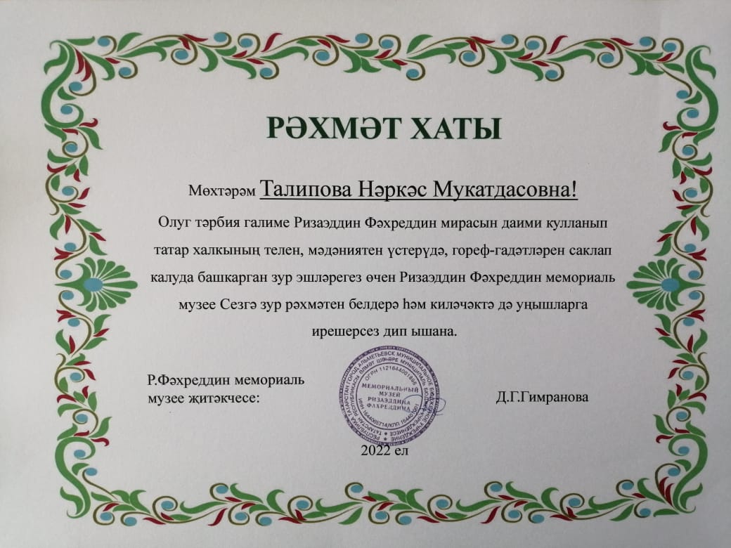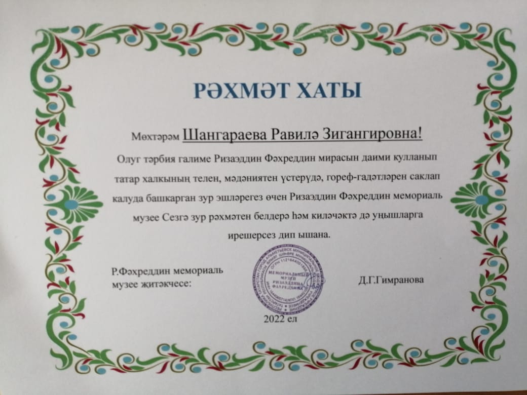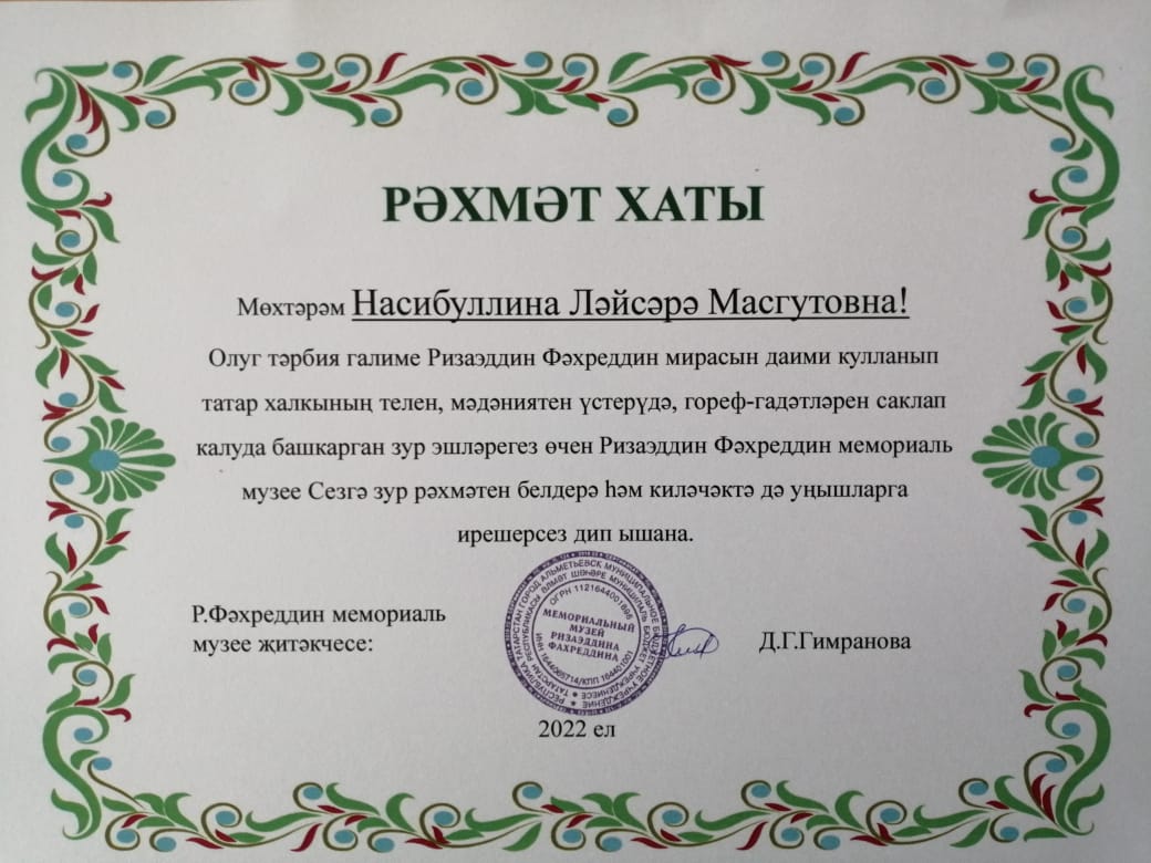Р.Фәхреддин музее белән эшчәнлек өчен алынган рәхмәт хатлары