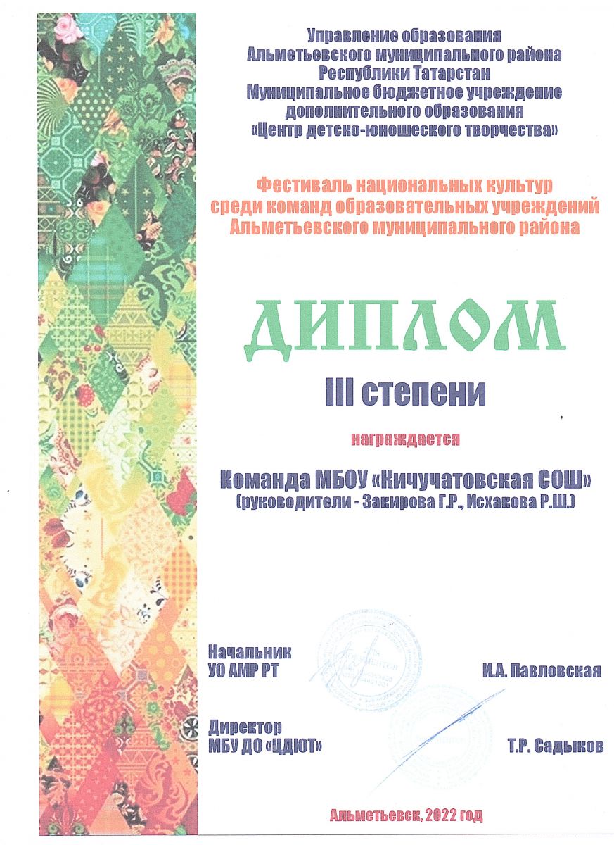 Диплом 3 степени "Фестиваль национальных культур среди команд ОУ АМР РТ"
