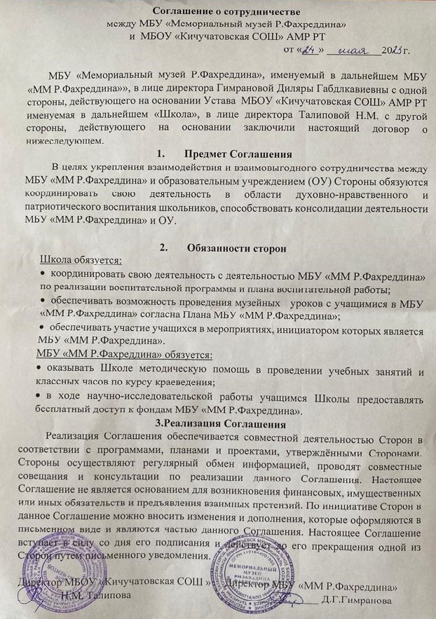 Соглашение о сотрудничестве между мемориальным музеем имени Р.Фахреддина и МБОУ "Кичучатовская СОШ".