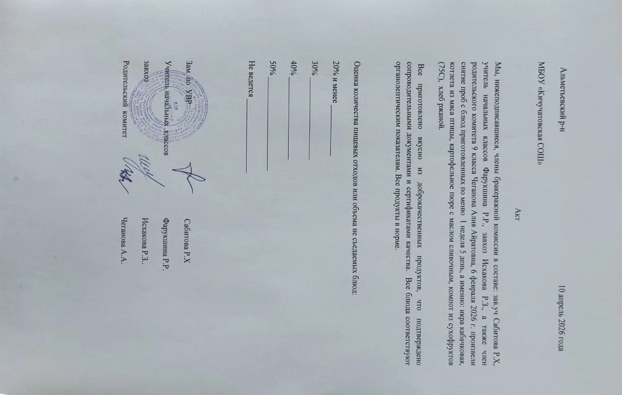 Акт проверки организации питания в школьной столовой от 10.04.2026 (родительский контроль)