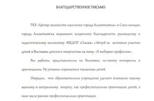 ГКУ "Центр занятости населения города Альметьевска" и Союза женщин города Альметьевска выражает искреннюю благодарность руководству и педагогическому коллективу МБДОУ "Сказка" с.Кичуй за активное участие детей в Выставке детского творчества на тему "Я выбираю профессию"