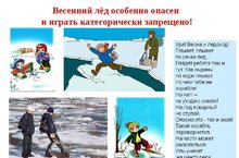 В весенний период повышается опасность выхода на лед водоемов, лед на реках во время весеннего паводка становится рыхлым, «съедается» сверху солнцем, талой водой, а снизу подтачивается течением. Очень опасно по нему ходить: в любой момент может рассыпаться под ногами и сомкнуться над головой.