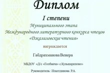 Наш воспитатель Габдрахманова Венера Ривгатовна награждена дипломом "1 степени" в международном литературном конкурсе чтецов "Джалиловские чтения" в номинации "М.Джалиль на татарском"
