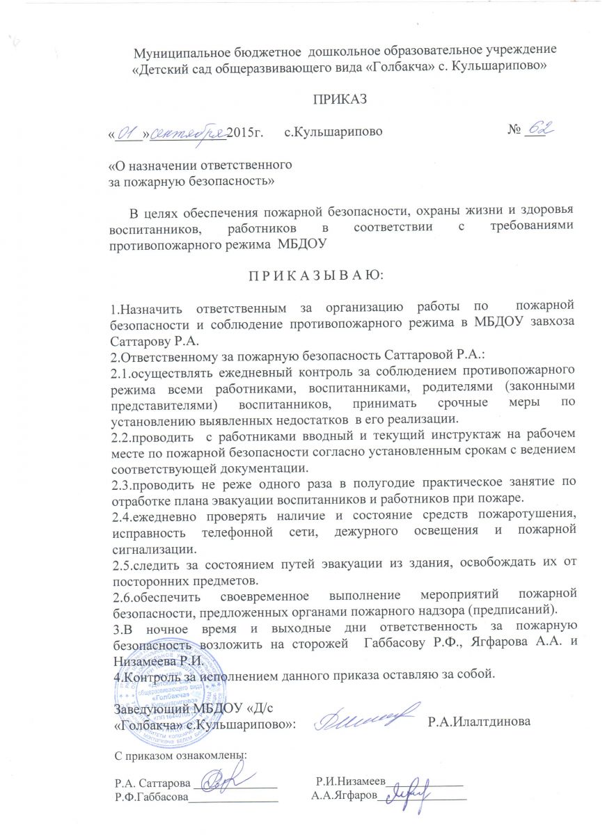 Приказ О назначении ответственного за пожарную безопасность
