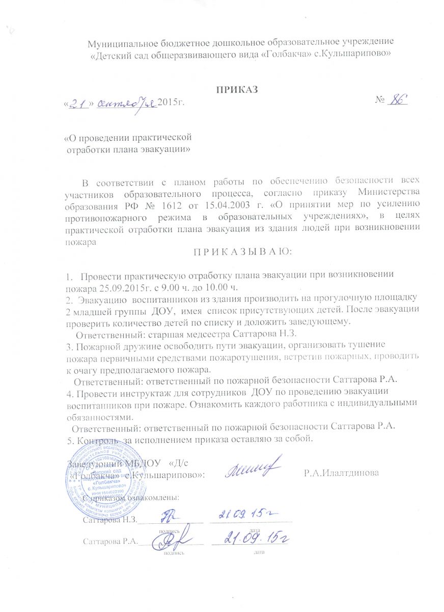 Приказ О проведении практической отработки плана эвакуации
