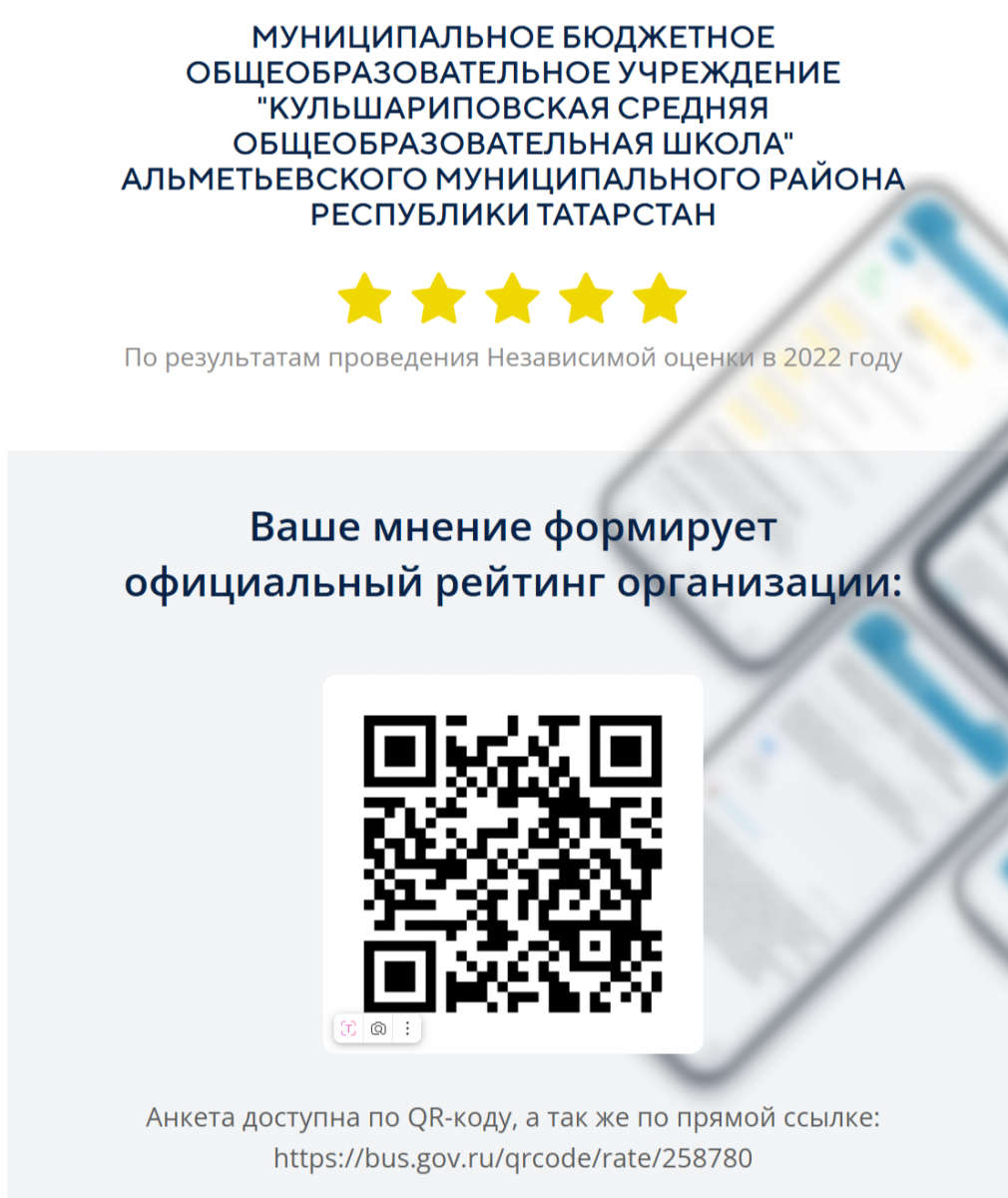 Вы можете оставить мнение о нашей организации. Чтобы оценить условия осуществления образовательной деятельности наведите камеру Вашего телефона и отсканируйте QR-код. Перейдя по ссылке, Вы сможете оценить