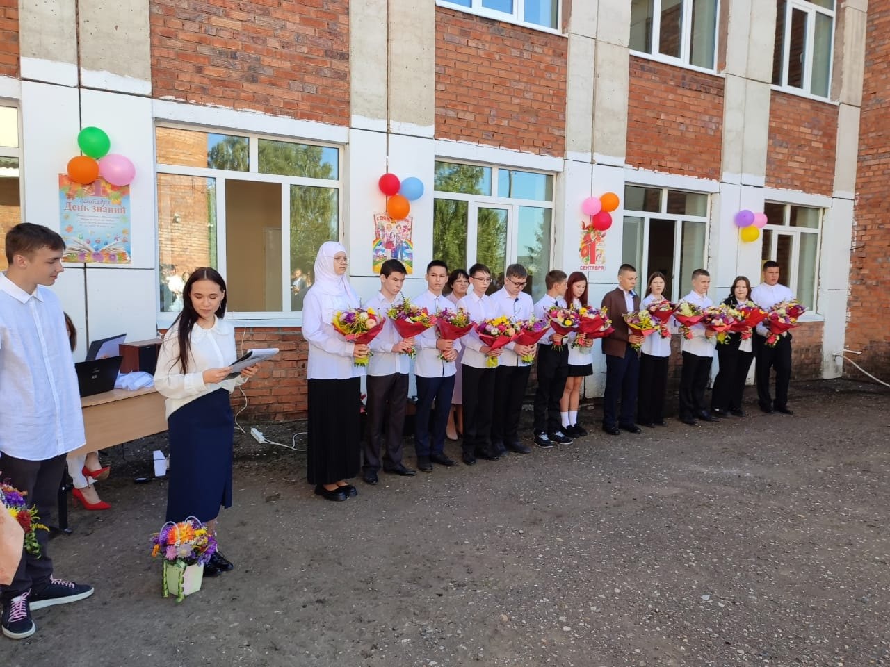 Нарядные ученики и ученицы с пестрыми букетами цветов, учителя и родители заполнили школьный двор.